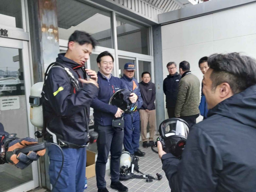 簡易テントへ煙発生装置により濃煙状態を模擬的につくり、実際に呼吸器を着装し要救助者が確認取れるか、バディーライトによる濃煙内での隊員の位置確認できるか体験していただきました。